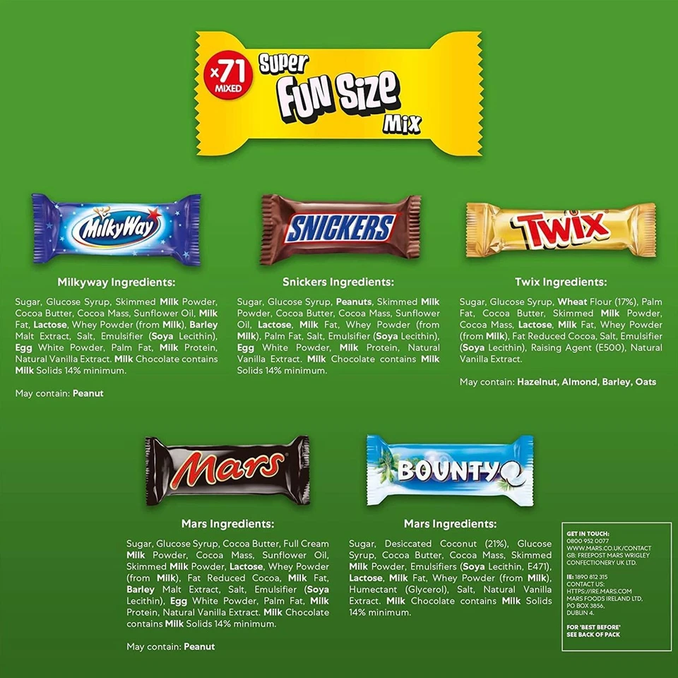 An assortment of our most popular chocolates, this multipack is full of snack bars in small fun sizes, ideal for treating yourself (and feeling like a giant when you hold one). This 1.4kg bulk chocolate bars bag contains 71 fun-size bars of Snickers, Mars, Bounty, Twix and MilkyWay. Popular for Birthday parties, and perfect Halloween chocolate, why not even add to your Christmas stockings or to your own advent calendar . These versatile snack bars are sure to delight, whether you’re sharing with friends or enjoying a festive indulgence!